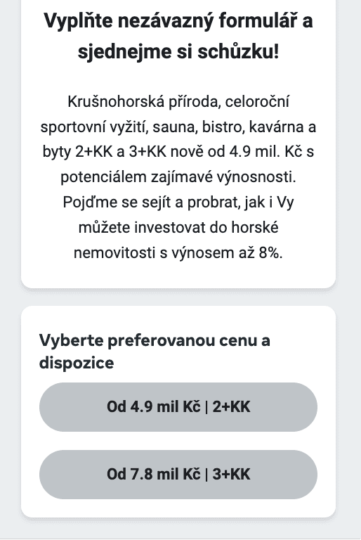 o nabídku ne příliš atraktivní, pokulhávají a jsou vhodné spíše jako berlička. V počátku června 2024 jsme proto spustili první reklamy využívající výše zmíněné metody, přičemž tyto reklamy byly zaměřené z části na investiční využití, ale hlavně na vlastní rekreaci